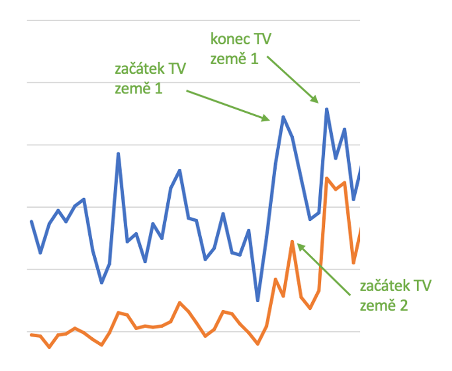 Pak se přibližně ve stejném čase spustila TV reklama v obou zemích. V zemi 1 se po dvou vlnách zastavila a zůstala běžet už jenom v zemi 2.