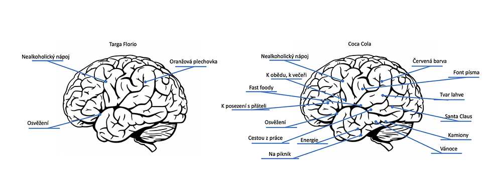 Níže ilustrativní příklad, jak to může vypadat u dvou značek nealkoholických nápojů. Je zjevné, že Coca Cola má jednak více asociací souvisejících s příležitostí/situací/potřebou, která může být spouštěč nákupu. A taky má více asociací s jejími symboly/rozpoznatelnými prvky. Jinými slovy Coca Cola napadne lidem ve větším počtu situací/potřeb, které budou chtít řešit nealko nápojem. A taky ji snadněji najdou/rozpoznají v regálu. Tím pádem je výrazně větší šance, že ji ve finále i nakoupí.